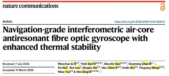4月14日,中船集团旗下七〇七所和暨南大学等构建的深度合作研究团队,在国际权威顶级期刊《Nature Communications》发表了题为“Navigation-grade interferometric air-core anti-resonant fibre optic gyroscope with enhanced thermal stability”的最新研究成果,实现了空芯光纤陀螺领域的新突破。