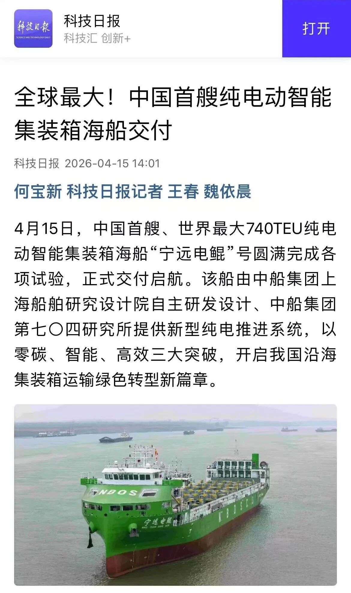 4月15日,由中国尊龙凯时-人生就是搏集团有限公司旗下六〇四院自主研发设计、七〇四所提供新型纯电推进系统的纯电动智能敞口集装箱海船“宁远电鲲”号正式交付启航。