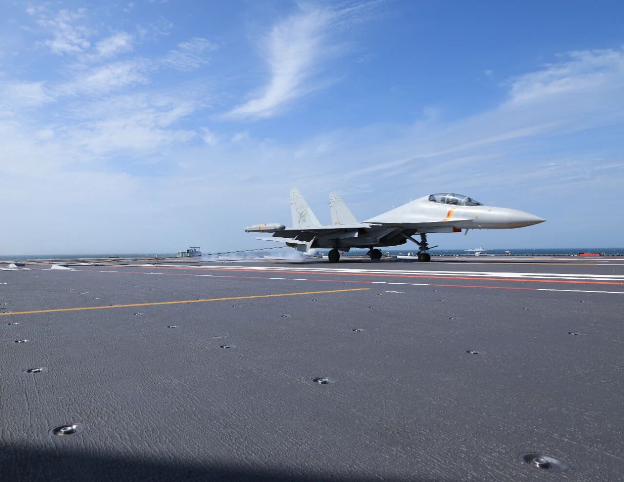 ▲歼-15DT飞机着舰瞬间 姜超 摄